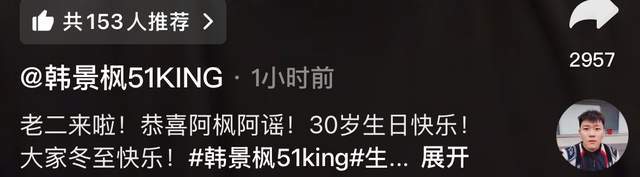 据了解,官宣喜讯当天还是韩景枫的30岁生日,作为两人的“爱情结晶”,按理来说“结晶”才是最重要的,但在李谣的视频中,韩景枫才是最重要的,一个将老公视为“最重要人物”的妻子,想来是很多男性,梦寐以求的结婚对象。